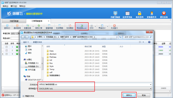 查詢明細顯示后在訂單明細查詢界面,點擊“導出到EXCEL”,可以修改導出文件路徑和文件名稱(默認導出路徑是軟件安裝文件內D:\信管飛軟件\信管飛送貨單軟件),將查詢結果導出到excel中,如圖所示: