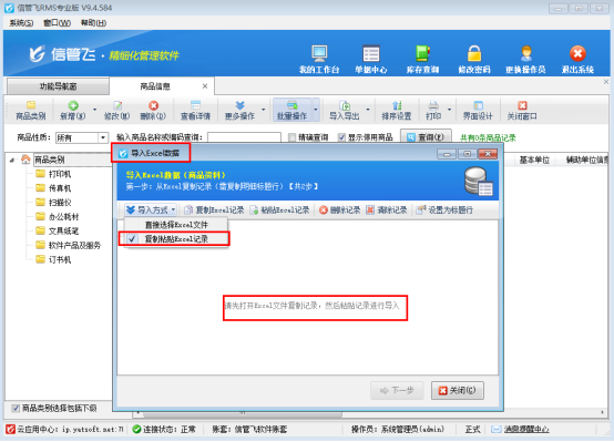 在功能導航窗點擊基礎資料—》商品信息,點擊“導入導出”按鈕下的導入商品資料,彈出導入界面。支持兩種導入方式,默認導入方式“復制粘貼Excel記錄”如下圖所示: