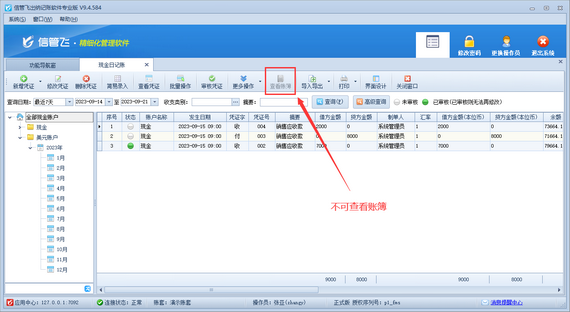 信管飛出納記賬軟件內包含豐富的記賬統(tǒng)計表格,如現(xiàn)金賬簿、銀行賬簿、資金日(月)報表、收支類別匯總表等。有用戶在使用軟件時無法查看出納賬簿,如下圖所示。
