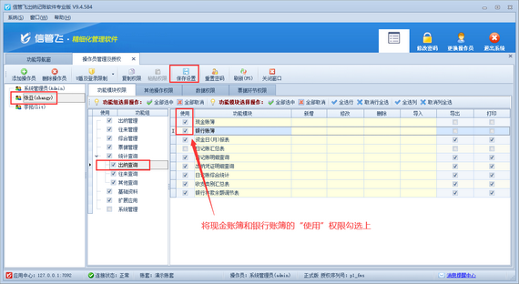 出現(xiàn)此問題的原因是:當前登錄的操作員賬號沒有“現(xiàn)金賬簿”和“銀行賬簿”的查看權限,解決方法如下:使用系統(tǒng)管理員賬號登錄軟件,在功能導航窗點擊“系統(tǒng)管理”—》“操作員及授權”打開操作員管理及授權界面,選擇操作員賬號,在其右側的功能模塊權限內選擇“出納查詢”,將“現(xiàn)金賬簿”和“銀行賬簿”的“使用”權限勾選上,然后保存權限設置,如下圖所示。