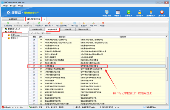 權(quán)限設(shè)置完成后,使用操作員賬號重新登陸軟件,重新標(biāo)記單據(jù)備注,即可成功標(biāo)記,如下圖所示。