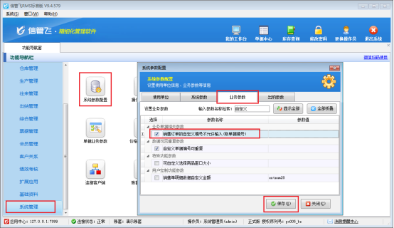 在功能導航窗點擊“系統管理”—》“系統參數配置”—》“業務參數”,業務單據相關參數下勾選“銷售訂單的自定義編號不允許輸入(取單據編號)”,之后點擊保存,如圖所示: