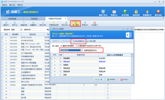 修改完成后操作全選并復制Excel文件內容,在軟件批量維護界面點擊工具欄“導入更新”按鈕,導入界面粘貼文件,下一步自動匹配對應數據項,選擇商品判斷方式,再點擊“開始導入”,如下圖所示: