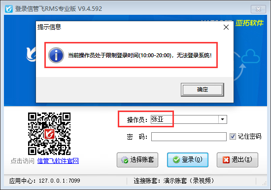 信管飛系列軟件支持自定義設置操作員登錄軟件的時間,設置后,操作員在受限制時間內則無法登錄軟件。出現以上問題的原因是,操作員在受限時間內登錄的軟件。