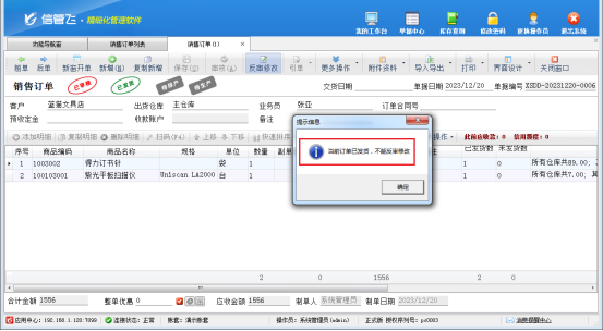 信管飛RMS軟件支持對銷售訂單進(jìn)行反審修改、紅沖操作,部分用戶在修改已發(fā)貨訂單時(shí)可能會出現(xiàn)“當(dāng)前訂單已發(fā)貨,不能反審修改”的提示,本篇文章以“信管飛RMS軟件”為例介紹下已發(fā)貨訂單無法修改如何解決?