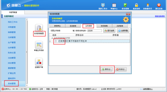 在功能導(dǎo)航窗點(diǎn)擊“系統(tǒng)管理”—》“系統(tǒng)參數(shù)配置”—》“業(yè)務(wù)參數(shù)”可以打開“業(yè)務(wù)參數(shù)”配置界面,在業(yè)務(wù)單據(jù)相關(guān)參數(shù)內(nèi)取消勾選“已發(fā)貨的訂單不可修改不可紅沖”參數(shù),然后點(diǎn)擊“保存”按鈕保存設(shè)置,如圖所示。