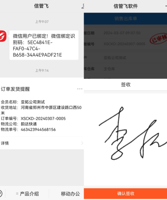 軟件中支持設(shè)置開單自動發(fā)送微信消息,客戶收到微信消息可點擊詳情查看詳情和收貨進行簽收操作。效果如下圖所示: