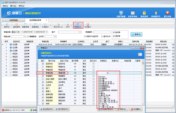 出現(xiàn)以上問(wèn)題的原因是:打開(kāi)送貨明細(xì)對(duì)賬單界面后,直接打開(kāi)“界面設(shè)計(jì)”功能配置單據(jù)日期格式,沒(méi)有先“查詢”數(shù)據(jù)。