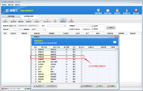 最近有客戶遇到如下問(wèn)題,在送貨明細(xì)對(duì)賬單“界面設(shè)計(jì)”內(nèi)設(shè)置日期格式時(shí),無(wú)法找到“日期格式”列,如下圖所示。