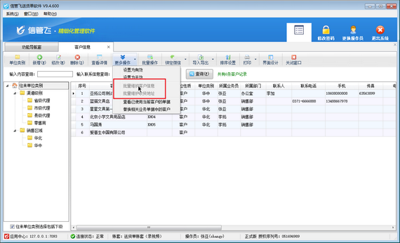 權限設置完成后,使用操作員賬號重新登陸軟件,打開客戶信息界面,在更多操作下拉列表即可操作批量維護客戶信息功能,如下圖所示。