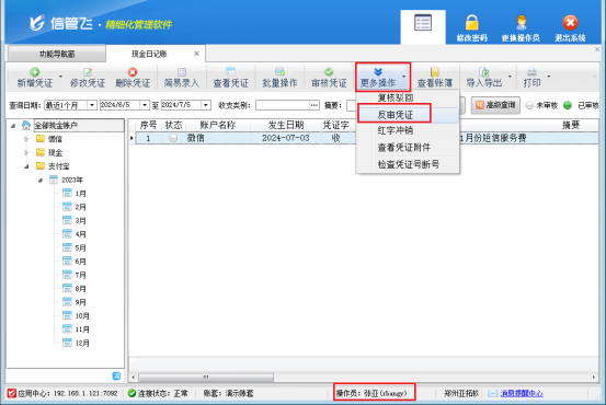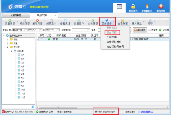 信管飛出納記賬軟件中支持反審憑證,憑證已審核后如發(fā)現(xiàn)填寫錯(cuò)誤,可以反審憑證,反審后,憑證狀態(tài)恢復(fù)為未審核狀態(tài),可以繼續(xù)對(duì)這個(gè)憑證進(jìn)行修改操作,然而,部分用戶反饋,在使用操作員賬號(hào)登錄時(shí),可能會(huì)遇到無法對(duì)已審核憑證執(zhí)行反審并修改的問題。切換系統(tǒng)管理員登錄,可以正常對(duì)憑證進(jìn)行修改,這是由于操作員沒有反審日記賬憑證導(dǎo)致的,本文以“信管飛出納記賬軟件”為例進(jìn)行示范。