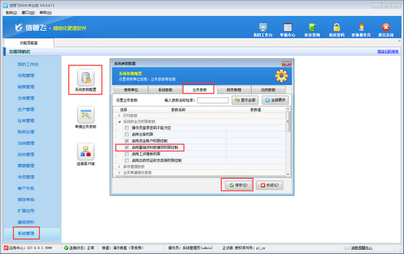 首先需要啟用基礎(chǔ)資料數(shù)據(jù)項權(quán)限控制參數(shù),在功能導(dǎo)航窗點擊“系統(tǒng)管理”—》“系統(tǒng)參數(shù)配置”—》“業(yè)務(wù)參數(shù)”打開業(yè)務(wù)參數(shù)配置界面,然后在系統(tǒng)安全及權(quán)限參數(shù)內(nèi)勾選啟用“啟用基礎(chǔ)資料數(shù)據(jù)項權(quán)限控制”參數(shù),然后點擊“保存”按鈕保存參數(shù)配置,如下圖所示。