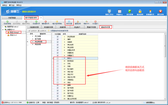 參數(shù)設(shè)置完成后,用系統(tǒng)管理員賬號,在功能導(dǎo)航窗點擊“系統(tǒng)管理”—》“操作員及授權(quán)”打開操作員管理及授權(quán)界面,選擇操作員賬號,然后在“基礎(chǔ)資料權(quán)限”界面將供應(yīng)商聯(lián)系方式相關(guān)信息勾選取消,如下圖所示。