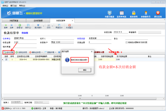 出現(xiàn)此提示原因是僅輸入了“收款金額”,沒(méi)有把收款金額分配到對(duì)應(yīng)明細(xì)項(xiàng)的“本次結(jié)銷金額”中,軟件支持“自動(dòng)分配”功能,輸入收款金額后點(diǎn)擊“自動(dòng)分配”,可自動(dòng)分配金額到“本次結(jié)銷金額”中,可方便有多條應(yīng)收款明細(xì)時(shí)快速操作。如下圖所示: