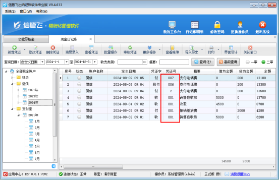 憑證號是出納憑證的重要標(biāo)識,它記錄了每一筆經(jīng)濟業(yè)務(wù)的唯一性,對于后續(xù)的賬務(wù)查詢分析至關(guān)重要。然而,在實際操作過程中,由于人為錯誤或系統(tǒng)調(diào)整等原因,可能會出現(xiàn)憑證號斷號的情況,這不僅影響了賬目的美觀性,還可能給后續(xù)的統(tǒng)計帶來困擾。信管飛出納軟件的日記賬檢查憑證號斷號功能,正是為了解決這一問題而生。問題如下圖所示: