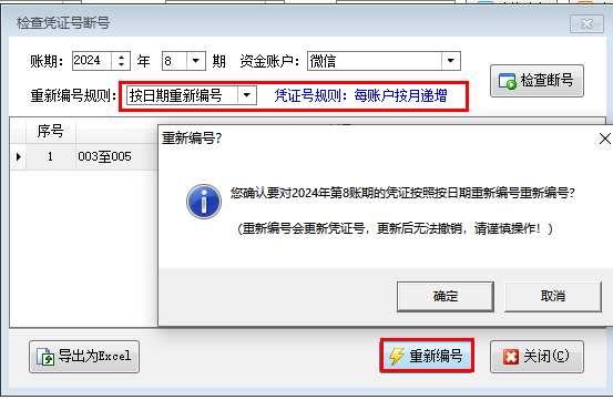 選擇賬期、資金賬戶、重新編號規(guī)則后,點擊“重新編號”按鈕,會按編號規(guī)則重新生成,如下圖所示: