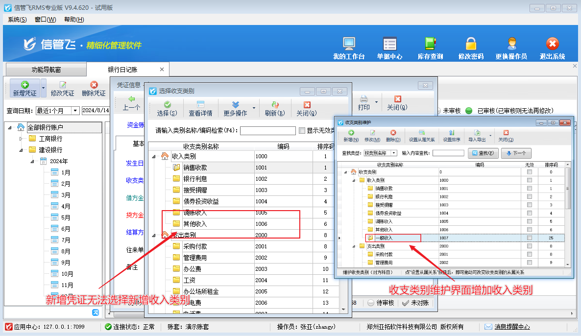 信管飛RMS標(biāo)準(zhǔn)版和專業(yè)版支持出納模塊,可登記現(xiàn)金和銀行日記賬,日記賬登記時(shí)需要選擇收支類別,支持新增收支類別。操作員新增收支類別后在新增憑證無法選擇新增的收支類別,該如何解決?