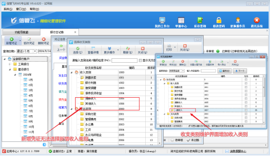 出現(xiàn)此問題原因:新增的收支類別,操作員沒有使用權(quán)限導(dǎo)致新增憑證找不到新的收支類別,如圖所示: