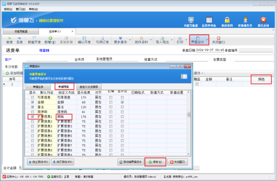 開單保存后,點擊右側相關查詢統計下“送貨明細對賬單”,進入送貨明細對賬單界面,點擊工具欄中的“界面設計”勾選“擴展信息1”,列名可以同樣自定義為顏色,之后保存,返回界面重新進行查詢,此時顏色已經正常顯示了,如圖: