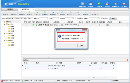 在軟件內(nèi)點(diǎn)擊“賬務(wù)處理”—》“會(huì)計(jì)憑證”,可打開(kāi)會(huì)計(jì)憑證列表界面,選中有誤憑證,單據(jù)操作下點(diǎn)作廢憑證,提示“會(huì)計(jì)憑證作廢失敗,單據(jù)日期不能小于當(dāng)前賬期2023-04-01”,無(wú)法直接作廢,如圖: