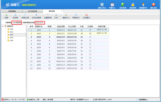 解決方法如下:功能導(dǎo)航欄點(diǎn)擊“賬務(wù)處理”—》“期末結(jié)賬”,工具欄點(diǎn)“反結(jié)賬”,反結(jié)賬完成后,相應(yīng)賬戶回退到上一個(gè)賬期,例如提示“單據(jù)日期不能小于當(dāng)前賬期2023-04-01”,就把賬期反結(jié)賬到2023年第3期,如圖:
