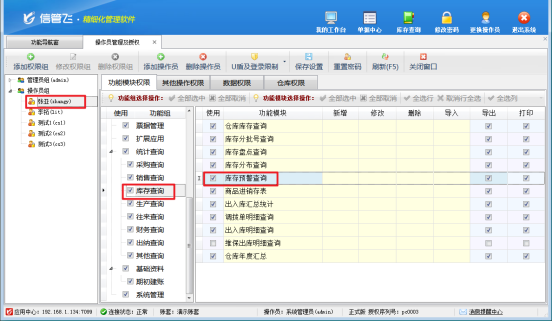 首先使用系統(tǒng)管理員賬號(hào)登錄軟件,在功能導(dǎo)航窗點(diǎn)擊“系統(tǒng)管理”—》“操作員及授權(quán)”打開(kāi)操作員管理及授權(quán)界面,選擇操作員“張亞”,在其右側(cè)的功能模塊權(quán)限內(nèi)選擇“庫(kù)存查詢”,將庫(kù)存預(yù)警查詢勾選,然后保存權(quán)限設(shè)置,如下圖所示: