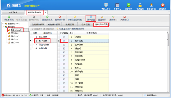 參數(shù)配置成功后,用“系統(tǒng)管理員”賬號(hào)登錄軟件,在功能導(dǎo)航窗點(diǎn)擊“系統(tǒng)管理”—》“操作員及授權(quán)”進(jìn)入“操作員管理及授權(quán)”界面,在權(quán)限模塊中可以看到啟用的基礎(chǔ)資料權(quán)限,選中操作員“張亞”,點(diǎn)擊“基礎(chǔ)資料權(quán)限”,選擇客戶(hù)信息,把“客戶(hù)名稱(chēng)”允許查看權(quán)限勾選,勾選后保存權(quán)限,如圖: