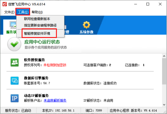 復(fù)制新電腦后,紅色應(yīng)用中心程序中點擊工具下的“智能修復(fù)軟件環(huán)境”,修復(fù)成功重啟即可正常使用軟件。