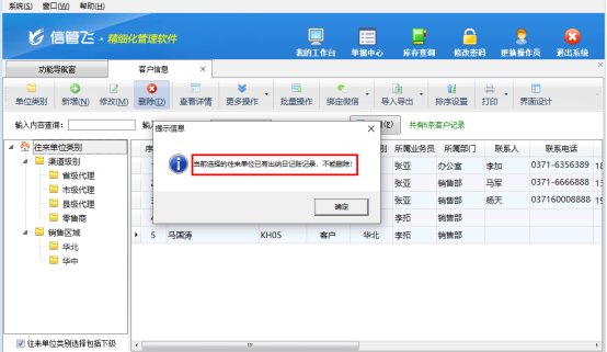 信管飛軟件刪除沒有開單的客戶信息時提示“當(dāng)前選擇的往來單位已有出納日記賬記錄,不能刪除”,如何解決?如下圖所示: