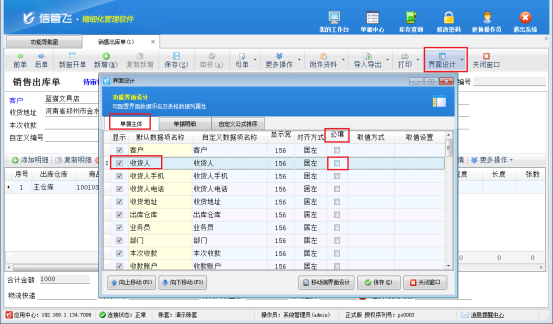 但如果您的企業(yè)不需要在開單時錄入收貨人信息,操作起來也非常簡單。只需在開單界面點擊上方工具欄的“界面設(shè)計”,選擇“單據(jù)主體”,在眾多數(shù)據(jù)項中找到“收貨人”,然后取消必填項的勾選符號,最后保存設(shè)置即可。