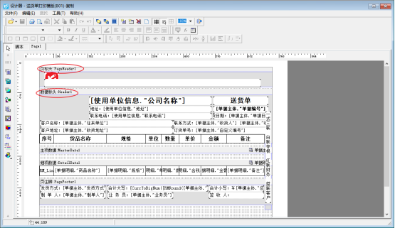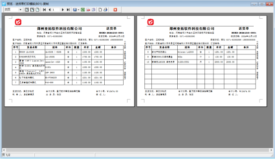 以銷售單為例,打開一張送貨單,點擊打印按鈕下的打印格式設計進入打印格式設計界面,選擇默認模板送貨單打印模板(B01)后打開設計格式界面,點擊打印預覽界面可以看到模板的標題每頁都顯示的,如下圖所示: