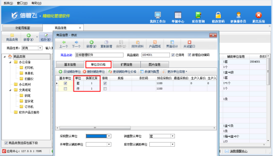 功能導航窗點擊基礎資料,打開商品信息界面,選擇商品信息點擊“修改”按鈕,在單位及價格界面,添加輔助單位,設置換算比率為1:1,支持新增多個輔助單位。如下圖所示: