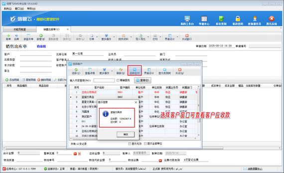 完成參數配置后,在銷售管理環節,當新開銷售出庫單時,在選擇客戶界面,企業人員就能清晰看到當前客戶的應收款情況,有助于及時把控銷售款項的回收。