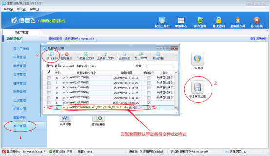 在功能導航欄點擊“系統管理”---“賬套備份還原”,在賬套備份還原界面點擊“執行備份”,完成最新數據備份。