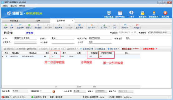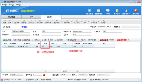 訂單數(shù)量100臺,第一次發(fā)貨數(shù)量20臺,第二次發(fā)貨數(shù)量10臺,累計數(shù)量30臺,打印預覽效果圖如下: