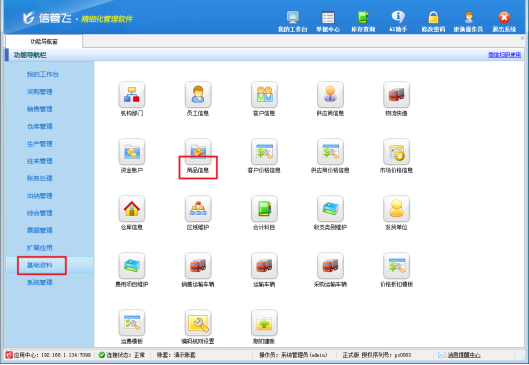 登錄軟件,在功能導航窗中點擊“基礎資料”-》“商品信息”,進入“商品信息”界面,這里匯聚了企業所有商品的相關信息,是進行貨位設置操作的起點。