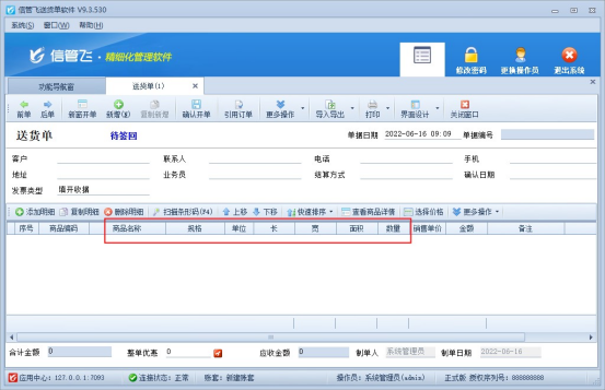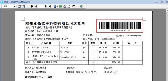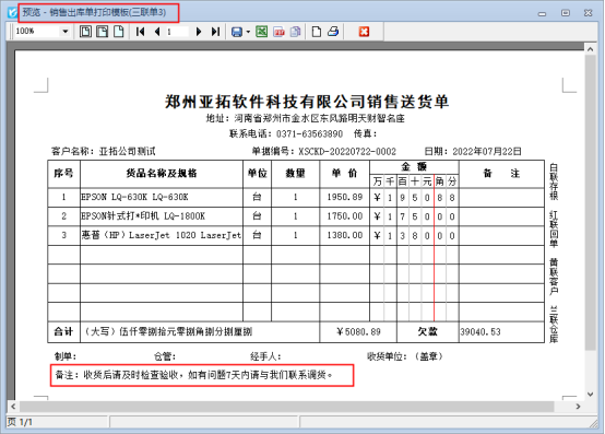 信管飛系列軟件都支持自定義設(shè)計(jì)打印模板,打印模板如果前期設(shè)計(jì)的時(shí)候沒有添加備注內(nèi)容(例如:注意事項(xiàng)),后期需要再添加該如何操作?本文以“信管飛送貨單軟件”為例進(jìn)行示范下。 新開送貨單確認(rèn)保存,默認(rèn)打印模板預(yù)覽界面如下圖: 需要添加備注內(nèi)容,在送貨單開單界